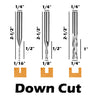 ダウンカットセット – シャンク直径: 6.35mm、切削直径: 1.58mm; 3.175mm; 6.35mm; 切削長: 12mm; 12mm; 22mm、全長: 60mm。